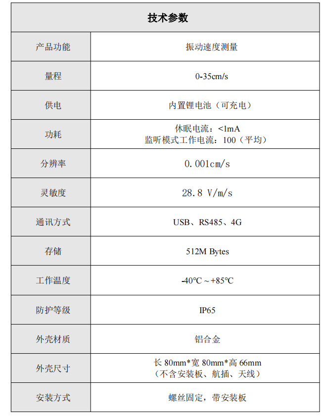 (1)量程:35cm/s;(2)分辨率:0.001cm/s;(3)靈敏度:28.8±5% V/m/s;(4)頻響范圍:5-300Hz(-3dB);