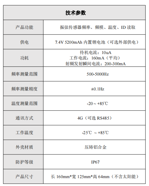 1. 支持滲壓計、鋼筋計、裂縫計、軸力計等各類振弦式頻率傳感器, 測量頻率范圍 500-5000Hz,測量精度±0.1Hz;
